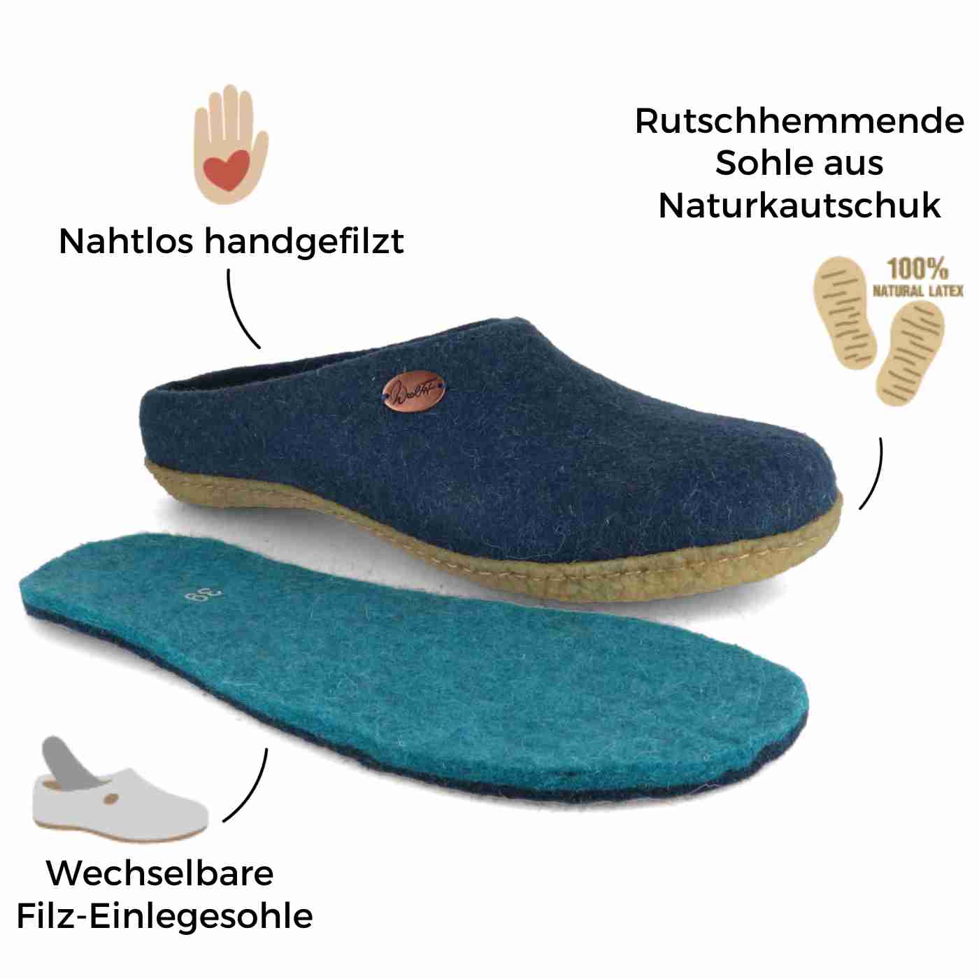 Filzpantoffeln mit Einlagen & Gummisohle Classic, blau
