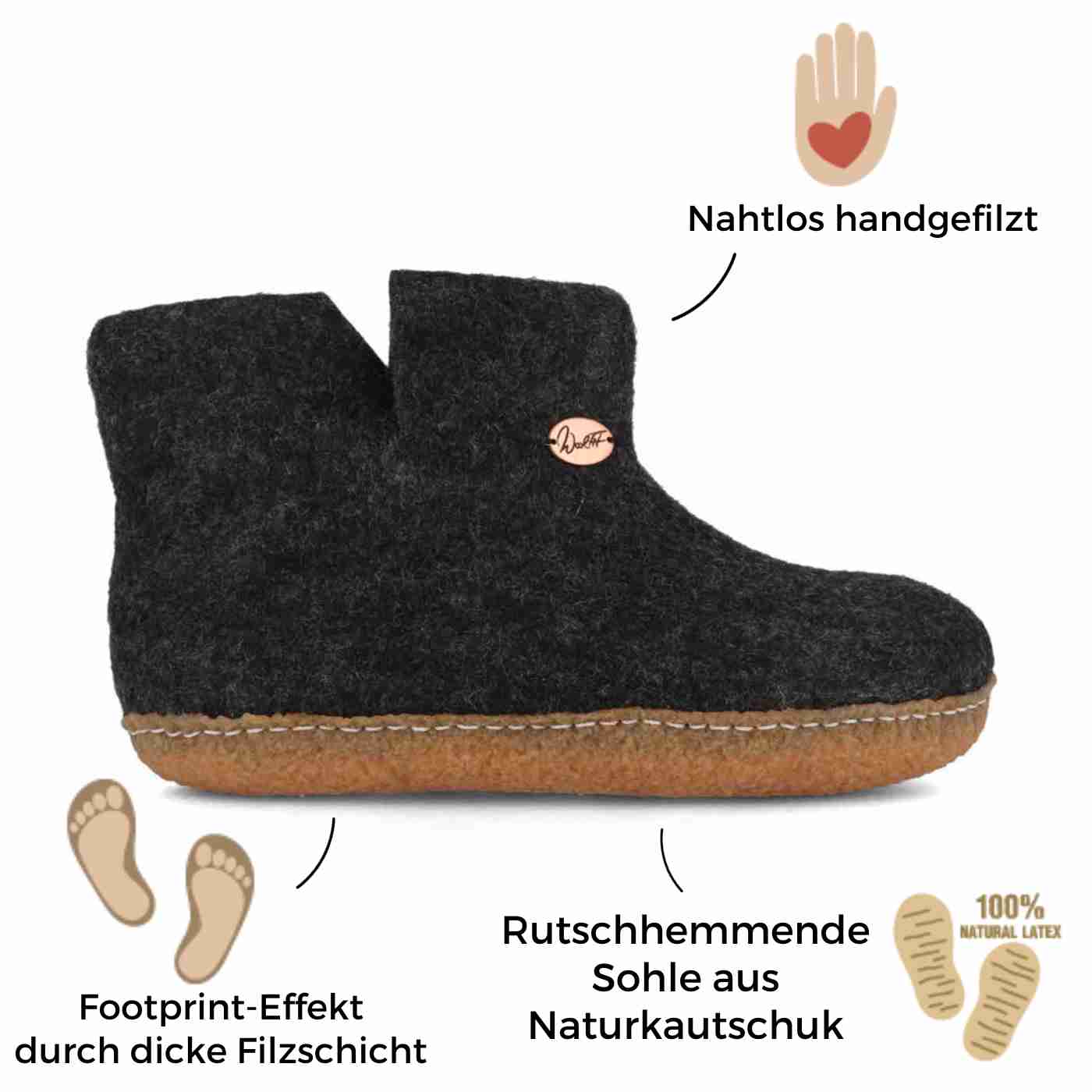 Wir setzen auf nachhaltige & hochwertige Rohstoffe, darunter 100% natürliche Schurwolle, Echtleder und Naturkautschuk.