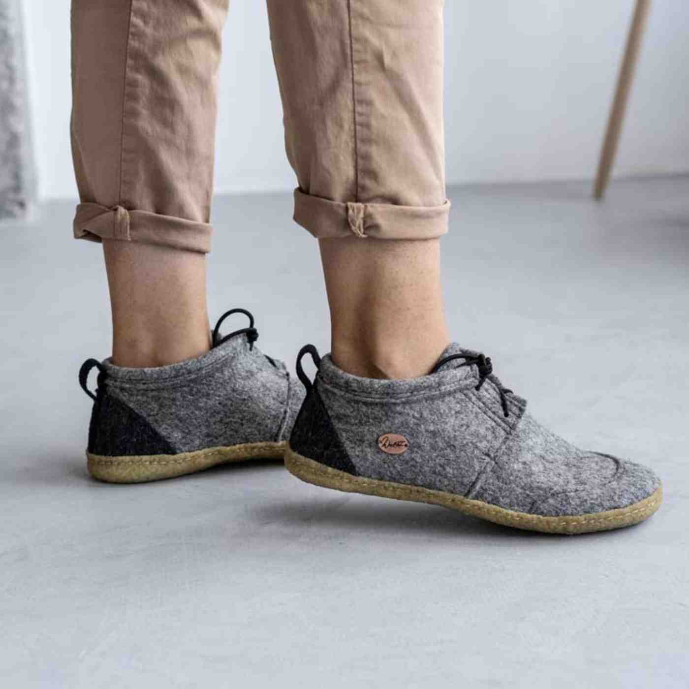 Der subtile, aber bemerkenswerte Unterschied zwischen beiden Modellen liegt darin, dass der Nomad zusätzlich über eine Schnürung verfügt. Diese Schnürung erlaubt es Dir, selbst zu entscheiden, wie fest oder locker die Filzhausschuhe an Deinen Füßen sitzen sollen.