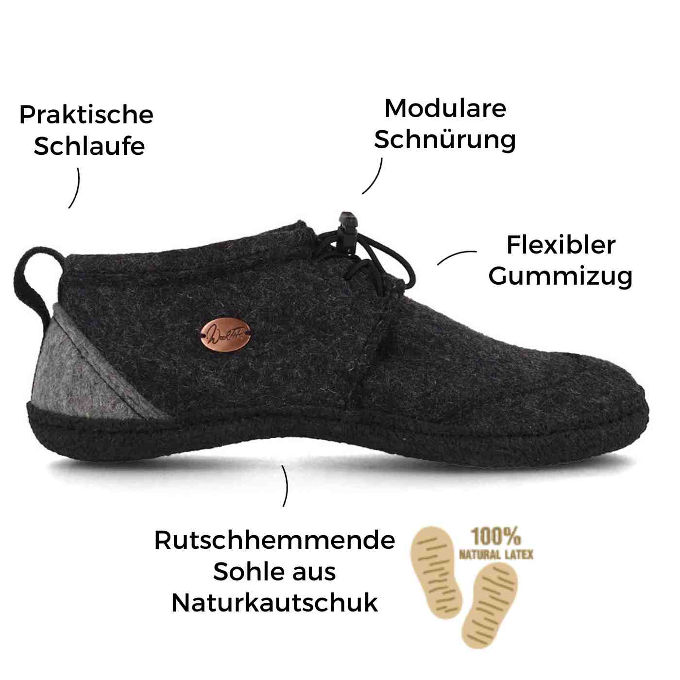 - Pflege: Zusätzlich können die Schuhe nach der Wäsche mit unserer Lanolin-Wollkur behandelt werden, um die natürlichen Eigenschaften der Wolle wiederherzustellen (schmutz- und wasserabweisend).