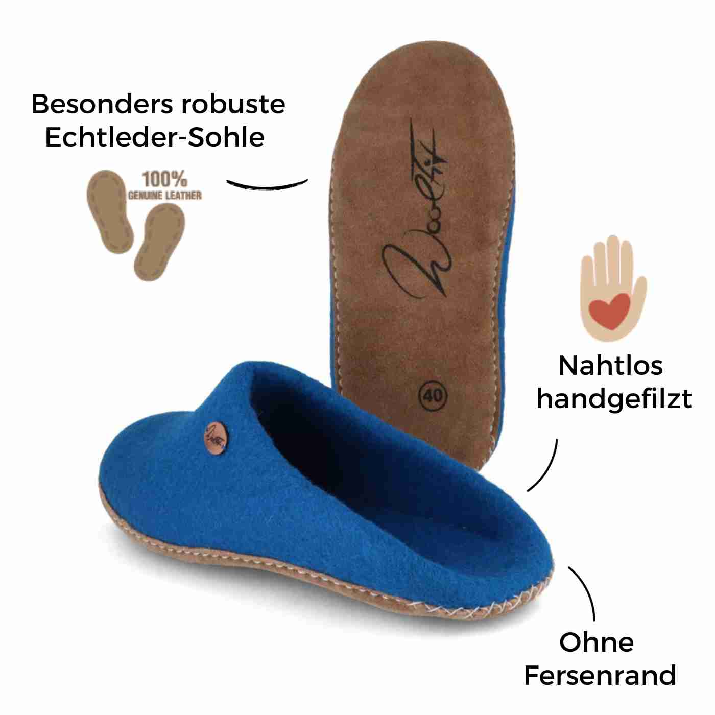 - Handwäsche: Wir empfehlen die Handwäsche, jedoch können WoolFits mit Ledersohle auch in der Waschmaschine gewaschen werden.
